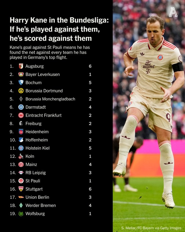 凱恩2年殺穿德甲球隊:對奧格斯堡&斯圖加特6球,對波鴻&基爾5球 3月30日訊 拜仁本輪德甲3-2擊敗圣保利,凱恩破門,這是他本賽季的第22個聯(lián)賽進球,同時憑借這個進球,凱恩對自己在德甲遇到過的所有對手都取得了進球。2023年夏天加入拜仁后,凱恩在德甲一共面對過19 2025/03/30