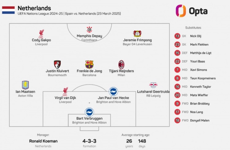 2017年11月9日以來(lái),荷蘭首發(fā)陣容首次無(wú)荷甲球員  3月24日訊 歐國(guó)聯(lián)1/4決賽次回合,荷蘭前往客場(chǎng)挑戰(zhàn)西班牙。本場(chǎng)比賽,荷蘭主帥科曼排出了一套沒(méi)有任何荷甲球員的首發(fā)陣容,2017年11月9日以來(lái)首次出現(xiàn)如此局面。以下為荷蘭首發(fā)陣容:門(mén)將:維爾布魯根  2025/03/24