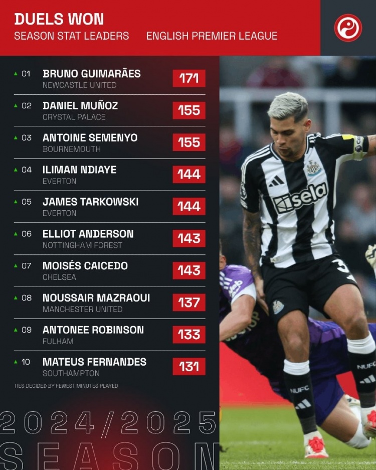 本賽季英超成功對(duì)抗榜:吉馬良斯居首,凱塞多、馬茲拉維在列 3月18日訊 國(guó)家隊(duì)比賽周到來(lái),英超也暫時(shí)告一段落,squakwa統(tǒng)計(jì)了本賽季英超成功對(duì)抗情況,吉馬良斯居首。本賽季英超成功對(duì)抗榜:1.吉馬良斯(紐卡),189次2.塞梅諾(伯恩茅斯),183次3.塔 2025/03/18