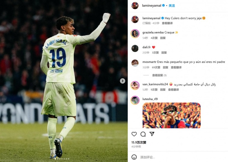 打破西甲4個半月進(jìn)球荒!亞馬爾社媒曬照慶祝:巴薩球迷們別擔(dān)心 3月17日訊 巴薩在本輪西甲4-2逆轉(zhuǎn)馬競,亞馬爾補(bǔ)時打進(jìn)關(guān)鍵反超球。第90+2分鐘,佩德里橫傳,亞馬爾外圍擺脫后勁射,皮球直掛網(wǎng)窩死角。數(shù)據(jù)統(tǒng)計顯示,亞馬爾也就此結(jié)束了長達(dá)4個半月的西甲進(jìn)球荒,他本 2025/03/17