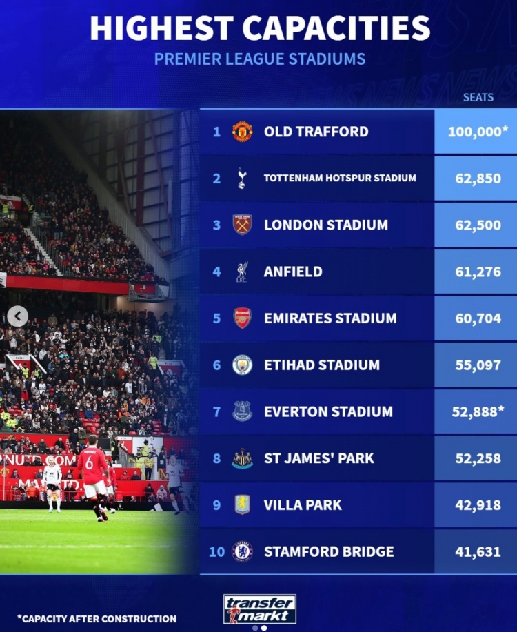 德轉(zhuǎn)列英超主場(chǎng)容量:曼聯(lián)新主場(chǎng)10萬(wàn)人將獨(dú)一檔 軍槍刺錘均6萬(wàn)人 3月11日訊 曼聯(lián)已經(jīng)官宣將建造能夠容納10萬(wàn)人的新主場(chǎng),《轉(zhuǎn)會(huì)市場(chǎng)》也列出了數(shù)年后的英超各隊(duì)主場(chǎng)容量榜。德轉(zhuǎn)列英超各隊(duì)主場(chǎng)容量:*仍未建成并投入使用曼聯(lián)*,預(yù)計(jì)100000熱刺,62850西漢姆,6 2025/03/12