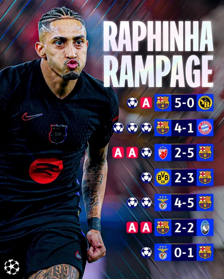 拉菲尼亞本賽季9場(chǎng)歐冠有7次參與進(jìn)球,共計(jì)9球5助攻&戰(zhàn)拜仁戴帽 3月11日訊 巴薩將在本輪歐冠坐鎮(zhèn)主場(chǎng)再戰(zhàn)本菲卡,拉菲尼亞的表現(xiàn)值得關(guān)注。歐冠官方數(shù)據(jù)統(tǒng)計(jì)顯示,拉菲尼亞本賽季在9場(chǎng)歐冠有7場(chǎng)能夠直接參與進(jìn)球,貢獻(xiàn)9球5助攻:5-0年輕人,1球1助攻4-1拜仁,3球 2025/03/12