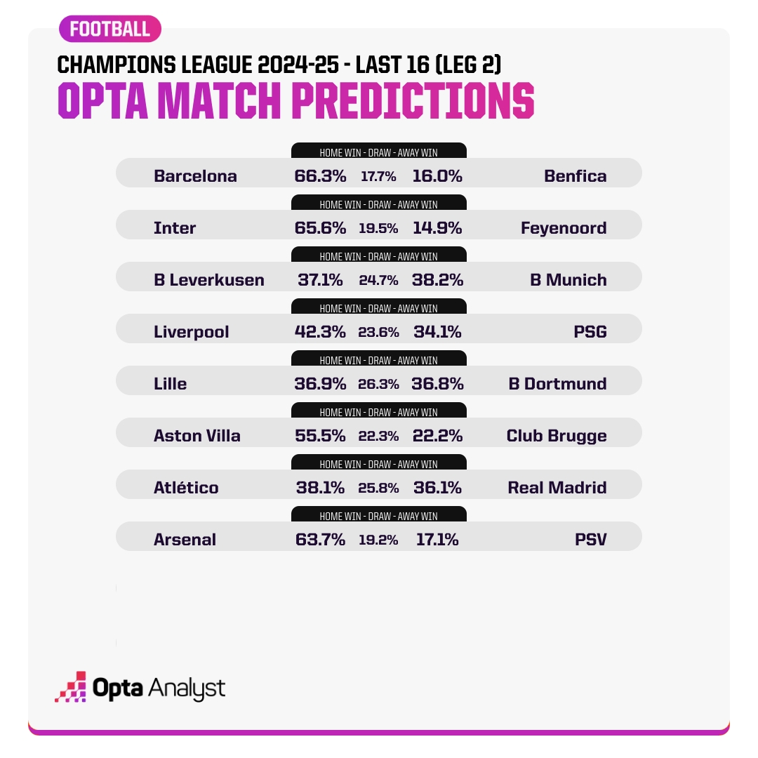 角逐8強(qiáng)!歐冠次回合勝率預(yù)測(cè):利物浦高于巴黎,馬競(jìng)稍勝皇馬 03月11日訊 歐冠1/8決賽次回合今夜明晨開打,半數(shù)8強(qiáng)隊(duì)伍將在一晚之內(nèi)決出。數(shù)據(jù)機(jī)構(gòu)Opta對(duì)歐冠1/8決賽次回合做出了預(yù)測(cè)。Opta預(yù)測(cè)歐冠1/8決賽次回合勝率:巴薩vs本菲卡:66.3%-16 2025/03/12