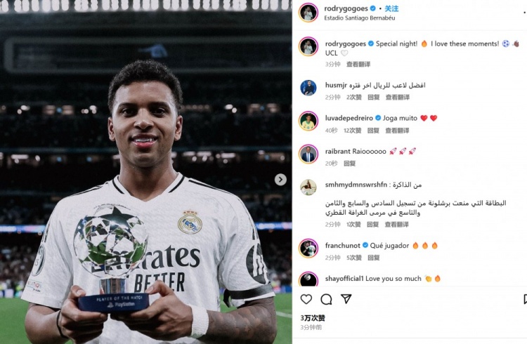 大心臟!羅德里戈社媒曬最佳獎杯:特別的夜晚!我愛這樣的時刻 3月5日訊 皇馬在本輪歐冠2-1力克馬競,羅德里戈開場便為主隊閃擊破門。第4分鐘,巴爾韋德送出直塞,羅德里戈右路內(nèi)切,過掉防守球員之后左腳破門。羅德里戈在賽后被歐冠官方評為本場最佳球員,他也通過社媒曬 2025/03/05
