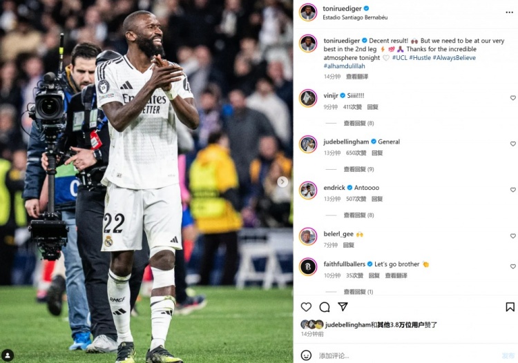 呂迪格社媒曬照:不錯的結(jié)果,但是下回合我們必須拿出最佳狀態(tài) 3月5日訊 在本輪歐冠,皇馬2-1擊敗馬競。賽后呂迪格也在個人社媒曬出本場照片,配文寫道:“不錯的結(jié)果,但是下一回合我們要拿出自己最佳的狀態(tài),感謝球迷們今夜難以置信的支持!” 2025/03/05