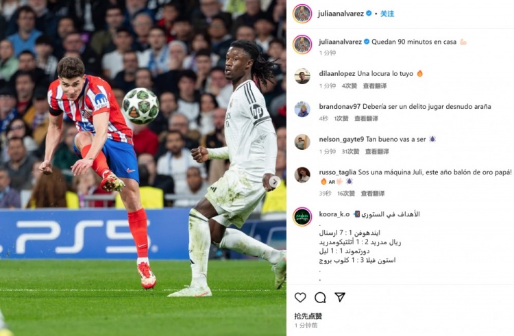內(nèi)切兜射世界波!阿爾瓦雷斯社媒曬進球瞬間:回到主場還有90分鐘 3月5日訊 馬競在本輪歐冠客場1-2不敵皇馬,阿爾瓦雷斯一度幫助客隊扳平比分。第32分鐘,阿爾瓦雷斯左路得球,擺脫卡馬文加防守后,禁區(qū)內(nèi)起腳兜射轟出世界波。阿爾瓦雷斯也在賽后通過社媒曬出自己的進球瞬間 2025/03/05