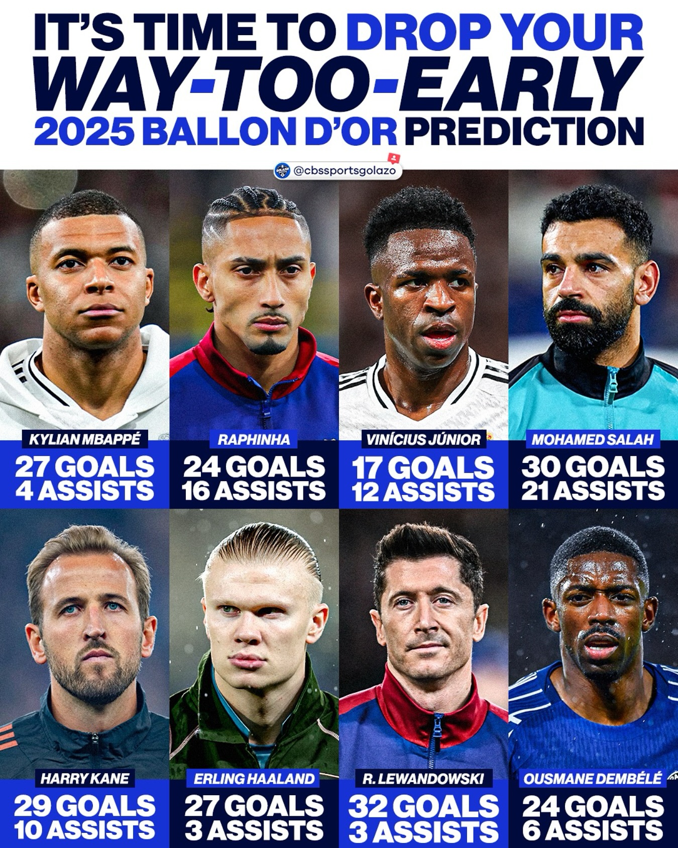 你看好誰?金球熱門人選數(shù)據(jù):薩拉赫30球21助 姆巴佩27球4助 CBS列2025年金球獎(jiǎng)熱門候選數(shù)據(jù),你更看好誰?姆巴佩:27球4助拉菲尼亞:24球16助維尼修斯:17球12助薩拉赫:30球21助凱恩:29球10助哈蘭德:27球3 2025/02/26