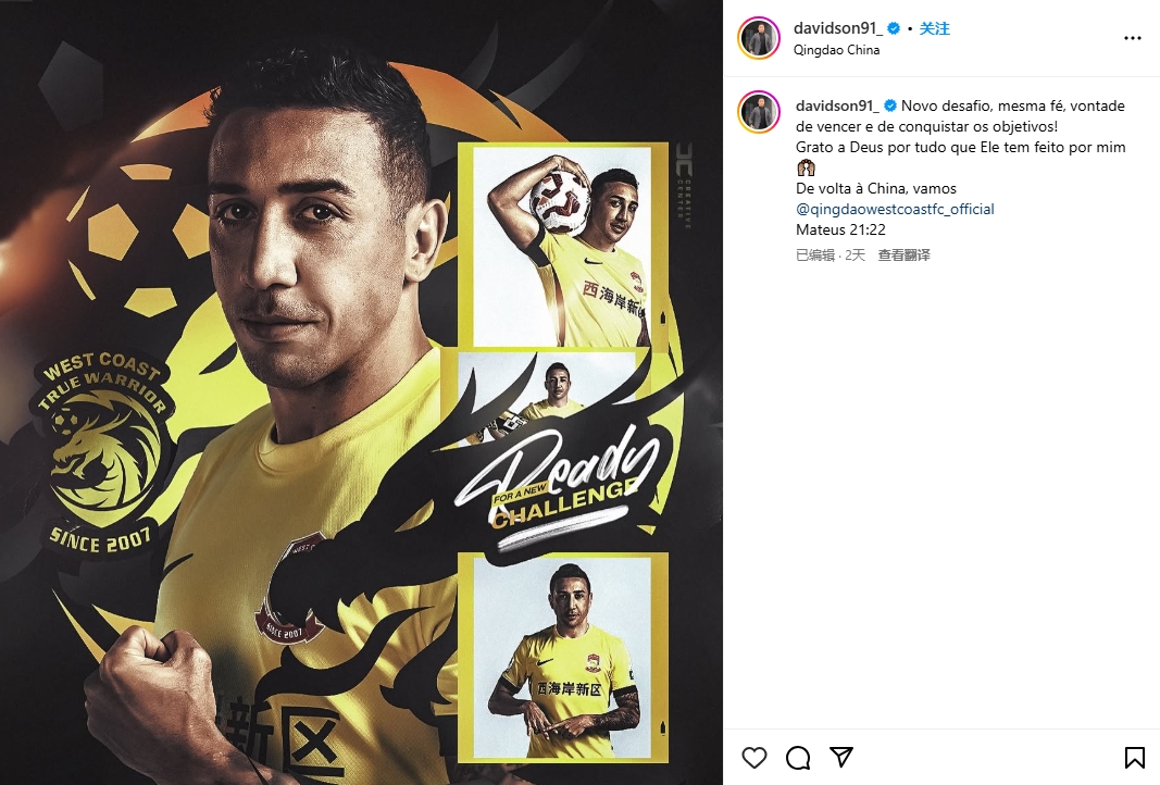 戴維森社媒發(fā)文談重返中超,陶強龍留言:NB 2月21日訊 正式加盟青島西海岸后,戴維森更新社媒,表達了自己重返中超的感言。戴維森曬出身披西海岸球衣的海報并配文寫道:“新的挑戰(zhàn),同樣的信念、勝利和實現(xiàn)目標(biāo)的意志!感謝上帝為我所做的一切!重返中國, 2025/02/21