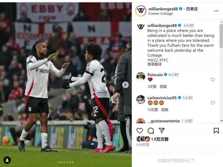 威廉社媒慶?;貧w富勒姆首秀:感謝球迷對(duì)我的熱情歡迎 2月17日訊 英超第25輪比賽,富勒姆主場(chǎng)2-1擊敗諾丁漢森林,36歲巴西邊鋒威廉替補(bǔ)出場(chǎng),上演回歸富勒姆之后的首秀。威廉在社交媒體上曬出自己替補(bǔ)出場(chǎng)的照片,配文:“在一個(gè)受人贊美的地方,比在一個(gè)被人 2025/02/17