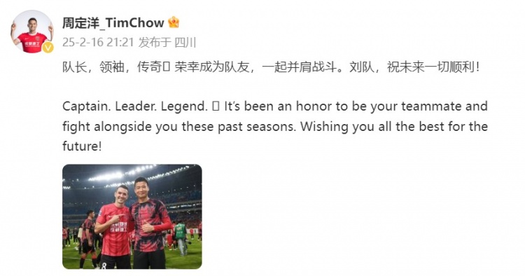 蓉城40歲老將劉濤離隊(duì),周定洋發(fā)文:領(lǐng)袖、傳奇,榮幸成為隊(duì)友 2月16日訊 成都蓉城俱樂部官方宣布,40歲老將劉濤離隊(duì),隊(duì)友周定洋在個(gè)人微博中為劉濤送上祝福。周定洋在個(gè)人微博中曬出與劉濤的合影,并寫道:隊(duì)長,領(lǐng)袖,傳奇,榮幸成為隊(duì)友,一起并肩戰(zhàn)斗。劉隊(duì),祝未來一 2025/02/16
