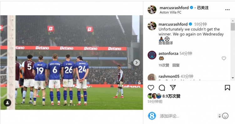 拉什福德社媒:很遺憾我們未能攻入制勝球,下周三繼續(xù)加油 2月16日訊 英超第25輪比賽,維拉主場(chǎng)1-1戰(zhàn)平伊普斯維奇。此役拉什福德為維拉替補(bǔ)出場(chǎng),他主罰任意球擊中橫梁,隊(duì)友沃特金斯補(bǔ)射破門。拉什福德賽后在社交媒體上曬出自己主罰任意球的照片,配文:“很遺憾我 2025/02/16