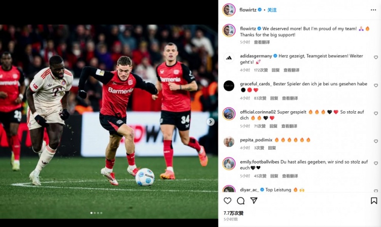 讀秒錯(cuò)失絕殺!維爾茨社媒:我們配得上更多!但仍為全隊(duì)感到驕傲 2月16日訊 勒沃庫(kù)森在本輪德甲焦點(diǎn)戰(zhàn)0-0被拜仁逼平,積分榜上仍然落后8分。維爾茨最后時(shí)刻錯(cuò)失絕殺。維爾茨也在賽后通過社媒曬出自己的比賽照,并配文:“我們配得上更多!但我仍然為全隊(duì)感到驕傲!感謝(主 2025/02/16