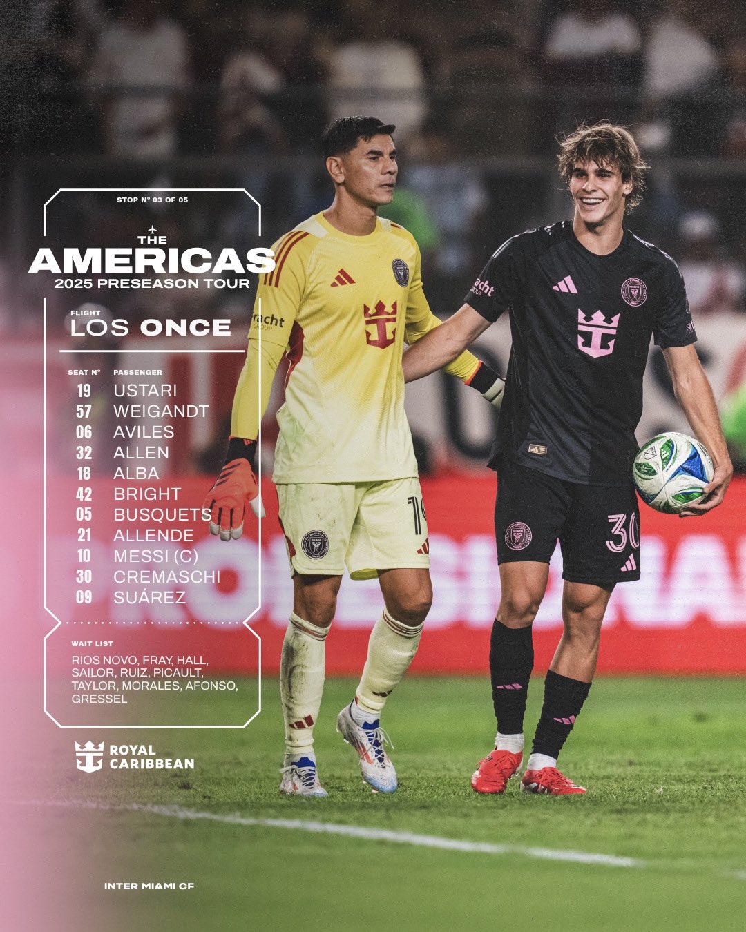 邁阿密?chē)?guó)際vs圣米格利托體育首發(fā):梅西、蘇亞雷斯、布斯克茨出戰(zhàn) 02月03日訊 熱身賽,邁阿密?chē)?guó)際客場(chǎng)對(duì)陣圣米格利托體育,賽前首發(fā)名單公布。邁阿密?chē)?guó)際首發(fā):19-烏斯塔里、57-韋甘特、6-阿維萊斯、32-阿倫、18-阿爾巴、42-布萊特、5-布斯克茨、21-阿連 2025/02/03