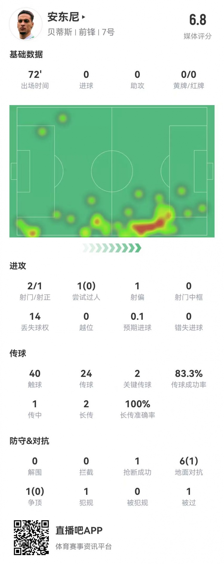 安東尼首秀數(shù)據(jù):2關(guān)鍵傳球+1造良機(jī) 7對(duì)抗1成功 獲評(píng)6.8分 2月3日訊 貝蒂斯在本輪西甲2-2暫時(shí)戰(zhàn)平畢巴,從曼聯(lián)外租而來(lái)的安東尼首秀數(shù)據(jù)如下:出場(chǎng)72分鐘40觸球24傳球、20成功,成功率83%2關(guān)鍵傳球1傳中、1成功2長(zhǎng)傳、2成功1創(chuàng)造重大機(jī)會(huì)2射門(mén)、1射 2025/02/03