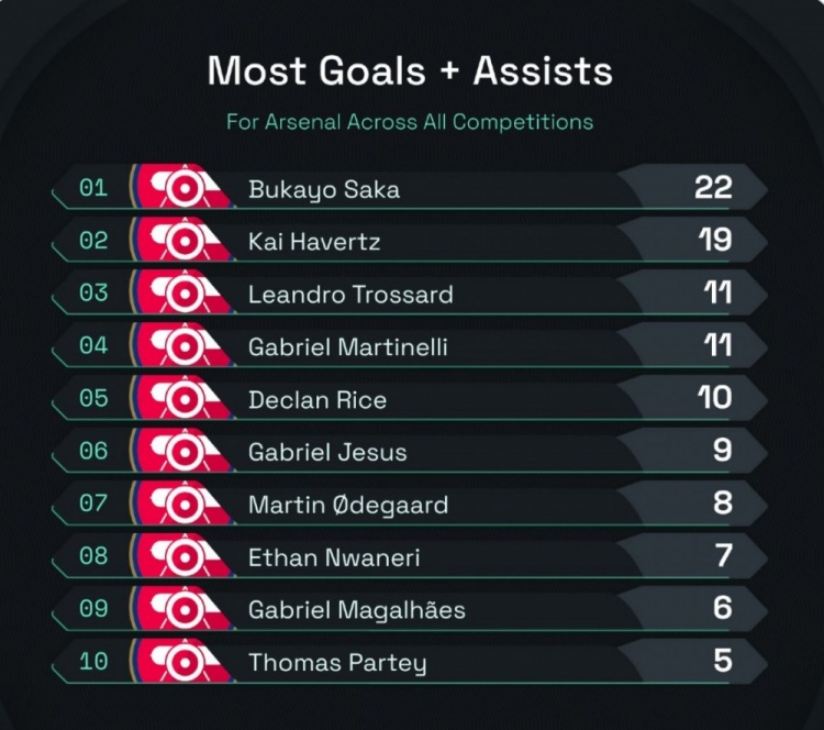 本賽季5名阿森納球員參與進(jìn)球10+,薩卡參與22球最多&哈弗茨19球 2月3日訊 英超第24輪比賽,阿森納主場(chǎng)5-1擊敗曼城。據(jù)Squawka統(tǒng)計(jì),本賽季5名阿森納球員參與進(jìn)球10+,其中薩卡參與22球最多,哈弗茨參與19球第二多。本賽季阿森納球員參與進(jìn)球榜(所有賽事) 2025/02/03