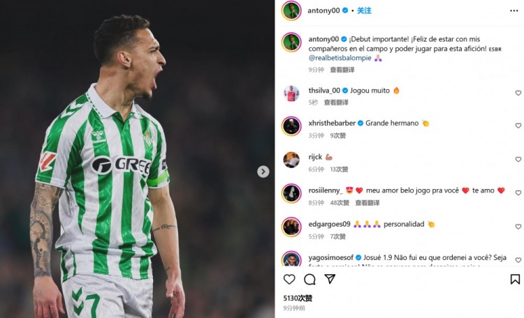 安東尼社媒紀(jì)念貝蒂斯首秀:關(guān)鍵的處子秀!很高興能為球迷們奮戰(zhàn) 2月3日訊 貝蒂斯在本輪西甲2-2戰(zhàn)平畢巴,從曼聯(lián)租借而來(lái)新援安東尼首發(fā)出戰(zhàn)并間接參與進(jìn)球。比賽第13分鐘,安東尼內(nèi)切射門(mén)被畢巴門(mén)將烏奈-西蒙撲出,伊斯科輕松補(bǔ)射破門(mén)。安東尼也在賽后通過(guò)社媒曬出慶祝照 2025/02/03