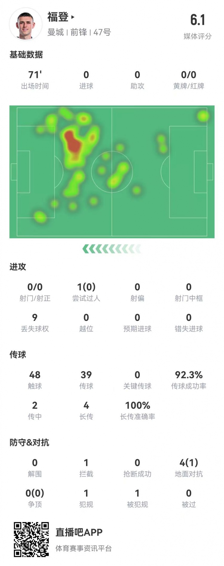 福登本場0射門0關(guān)鍵傳球 4對(duì)抗1成功 1失誤導(dǎo)致丟球 獲評(píng)6.1分 2月3日訊 阿森納在本輪英超主場對(duì)陣曼城,福登本場數(shù)據(jù)如下:首發(fā)出戰(zhàn)71分鐘48觸球39傳球、36成功,成功率92%2傳中、0成功4長傳、4成功1過人、0成功4對(duì)抗、1成功9丟失球權(quán)1犯規(guī)1造犯規(guī)1攔 2025/02/03