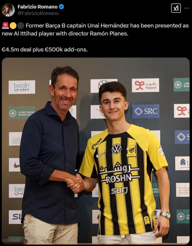 羅馬諾:前巴薩B隊(duì)隊(duì)長埃爾南德斯加盟吉達(dá)聯(lián)合,轉(zhuǎn)會(huì)費(fèi)450萬歐 2月3日訊 據(jù)知名轉(zhuǎn)會(huì)專家羅馬諾報(bào)道,前巴薩B隊(duì)對(duì)長烏奈-埃爾南德斯加盟吉達(dá)聯(lián)合。報(bào)道稱吉達(dá)聯(lián)合將會(huì)為烏奈-埃爾南德斯支付450萬歐固定轉(zhuǎn)會(huì)費(fèi),還有50萬歐的浮動(dòng)獎(jiǎng)金。 2025/02/03