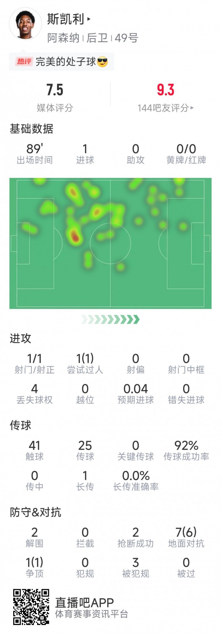 收獲處子球!斯凱利本場數(shù)據(jù):1粒進(jìn)球,2搶斷,8次對(duì)抗7次成功 2月3日訊 在本輪英超阿森納對(duì)陣曼城的比賽中,小將斯凱利發(fā)揮出色,以下為他在本場數(shù)據(jù):比賽時(shí)間89分1粒進(jìn)球1次射門1次過人41次觸球傳球成功率92%2次解圍2次搶斷8次對(duì)抗7次成功sofa評(píng)分7.5 2025/02/03
