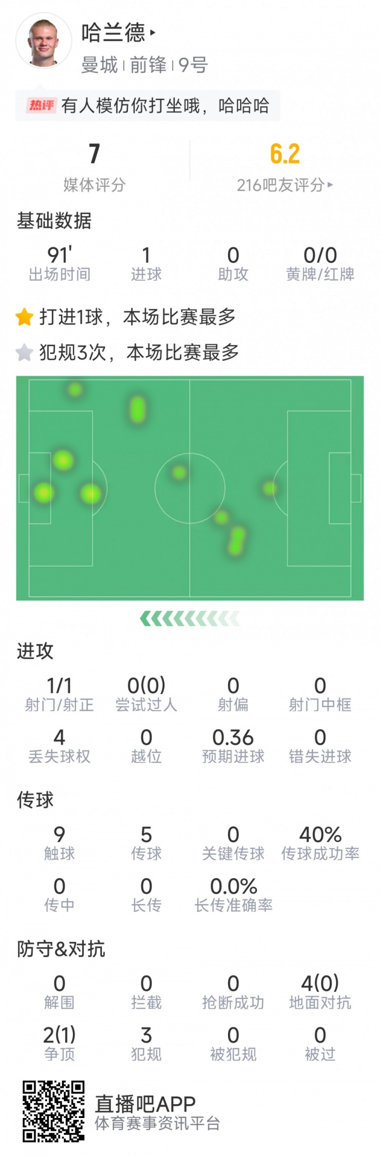疑似上場!哈蘭德半場:僅觸球6次,射門過人等掛零,犯規(guī)1次 2月3日訊 本輪英超焦點(diǎn)戰(zhàn),曼城客戰(zhàn)阿森納。半場戰(zhàn)罷,曼城暫時(shí)0-1落后對(duì)手。上半場,哈蘭德參與感不強(qiáng),一共只觸球6次。哈蘭德半場主要數(shù)據(jù)↓觸球:6丟失球權(quán):3傳球:3傳球成功率:33.3%射門:0射 2025/02/03