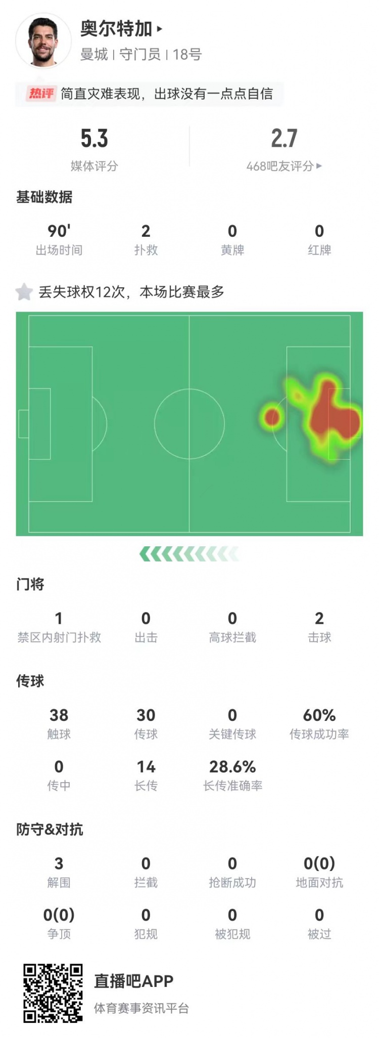奧爾特加本場(chǎng)2撲救 預(yù)期撲出-2.11球 1失誤致丟球 5.3分全場(chǎng)最低 2月3日訊 曼城在本輪英超1-5慘敗阿森納,奧爾特加本場(chǎng)數(shù)據(jù)如下:首發(fā)踢滿全場(chǎng)2撲救、1撲救禁區(qū)內(nèi)射門(mén)預(yù)期撲出-2.11球(門(mén)將若正常發(fā)揮應(yīng)該是正值)2拳擊球1失誤導(dǎo)致丟球38觸球30傳球、18成功, 2025/02/03