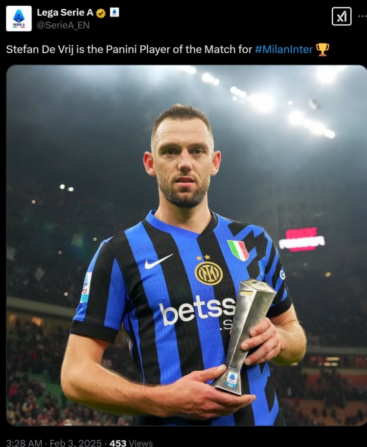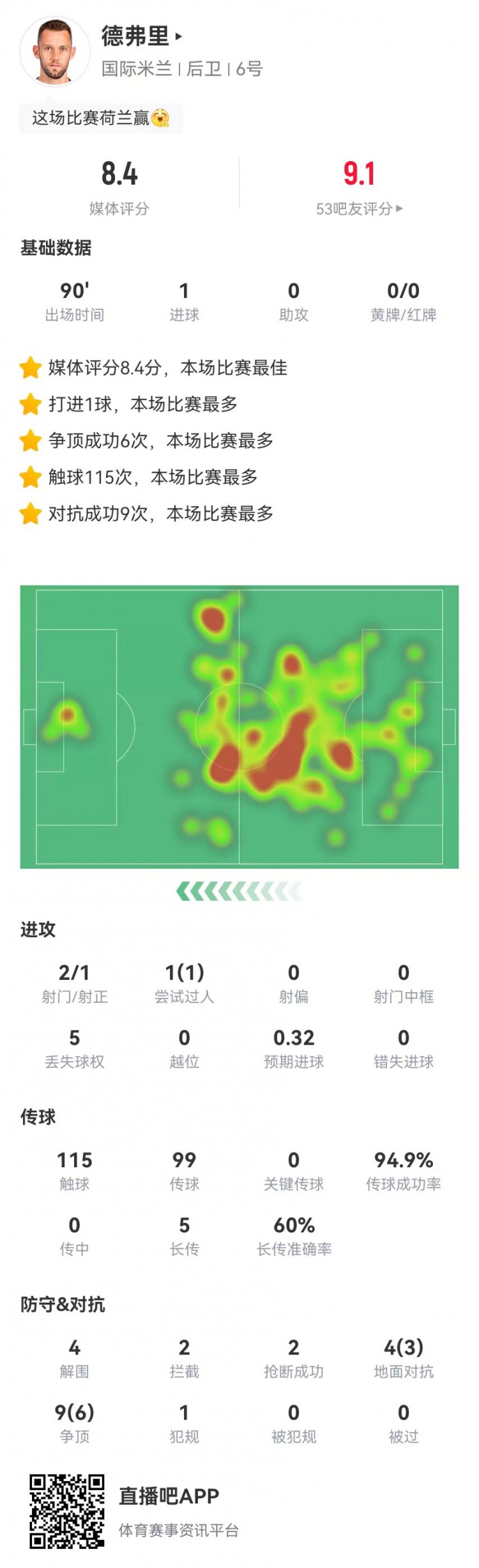 打進(jìn)絕平球!意甲官方:德弗里當(dāng)選國(guó)米1-1米蘭全場(chǎng)最佳球員 2月3日訊 剛剛結(jié)束的米蘭德比中,國(guó)米1-1絕平米蘭。賽后,打入絕平進(jìn)球的德弗里當(dāng)選全場(chǎng)最佳球員。本場(chǎng)比賽中,德弗里2次射門(mén)1次射正便打進(jìn)1球,他1次過(guò)人成功,傳球成功率高達(dá)95.9%。在防守端,德弗 2025/02/03