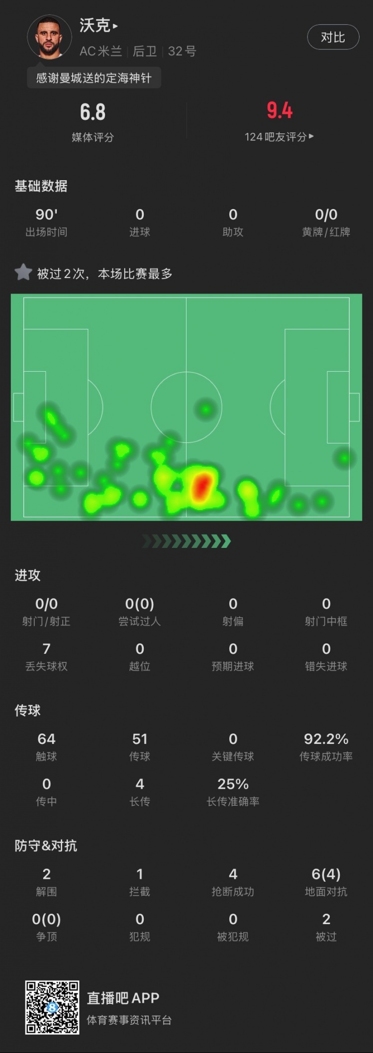 沃克米蘭首秀數(shù)據(jù):貢獻(xiàn)2解圍4搶斷,6次對(duì)抗成功4次,被過(guò)2次 2月3日訊 在剛剛結(jié)束的米蘭德比中,米蘭1-1遭國(guó)米絕平。本場(chǎng)比賽,沃克迎來(lái)了自己的米蘭生涯首秀,最終獲評(píng)6.8分。沃克本場(chǎng)主要數(shù)據(jù)↓觸球:64丟失球權(quán):7傳球:51傳球成功率:92.2%長(zhǎng)傳:4長(zhǎng)傳 2025/02/03