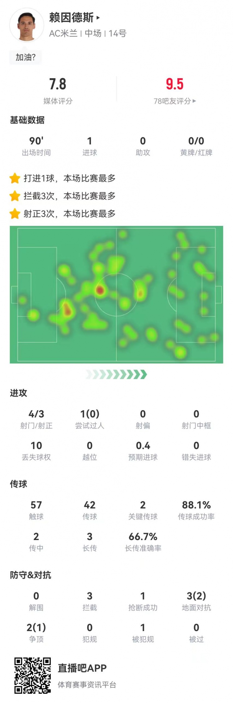 賴(lài)因德斯本場(chǎng)4射3正進(jìn)1球 2關(guān)鍵傳球+3攔截 獲評(píng)7.8分全隊(duì)最高 2月3日訊 米蘭在本輪意甲1-1戰(zhàn)平國(guó)米,賴(lài)因德斯本場(chǎng)數(shù)據(jù)如下:出場(chǎng)90分鐘1球預(yù)期進(jìn)球0.4057觸球42傳球、37成功,成功率88%2關(guān)鍵傳球2傳中、0成功3長(zhǎng)傳、2成功4射門(mén)、3射正1過(guò)人、0成 2025/02/03
