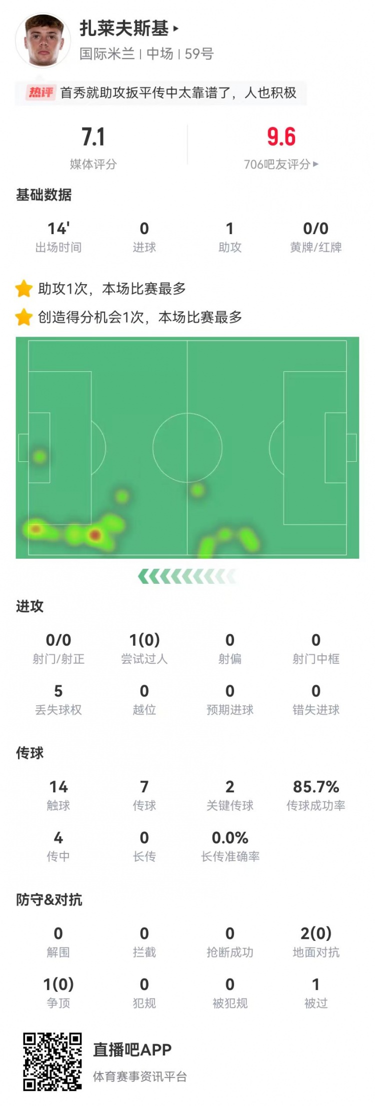 首秀送助攻!扎萊夫斯基本場(chǎng)替補(bǔ)1助攻+2關(guān)鍵傳球 獲評(píng)7.1分 2月3日訊 國(guó)米在本輪意甲1-1戰(zhàn)平米蘭,扎萊夫斯基首秀數(shù)據(jù)如下:替補(bǔ)出戰(zhàn)14分鐘1助攻預(yù)期助攻值0.8314觸球7傳球、6成功2關(guān)鍵傳球4傳中、2成功1創(chuàng)造重大機(jī)會(huì)1過(guò)人、0成功3對(duì)抗、0成功5丟失 2025/02/03