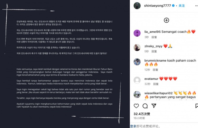 申臺(tái)龍發(fā)聲明警告印尼媒體:如果再發(fā)布不實(shí)傳聞,就不會(huì)輕易翻篇 2月2日訊 今日前印尼主帥申臺(tái)龍更新社媒,用韓語(yǔ)和印度尼西亞語(yǔ)發(fā)布聲明,對(duì)部分印尼媒體進(jìn)行警告。近期有印尼媒體報(bào)道,稱(chēng)申臺(tái)龍?jiān)趫?zhí)教印尼國(guó)家隊(duì)期間使用“水軍”,在申臺(tái)龍受到批評(píng)時(shí)有一個(gè)指定賬戶(hù)就會(huì)發(fā)消息 2025/02/02