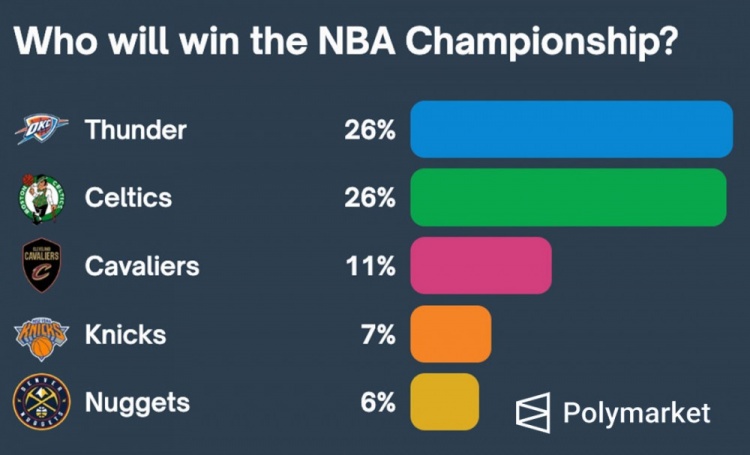 美媒預(yù)測(cè)奪冠概率:雷霆&綠軍皆26%最高 騎士/尼克斯/掘金列3-5 美媒Polymarket Sports預(yù)測(cè) 2025/02/02
