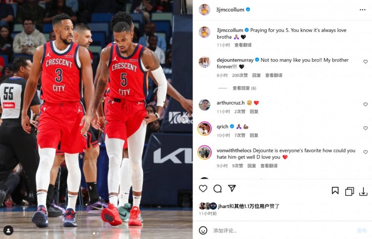 賽季報銷!CJ祝福德章泰-穆雷 后者:你這樣的不多了 永遠(yuǎn)的兄弟 2月2日訊 此前鵜鶘官方宣布,球隊后衛(wèi)德章泰-穆雷被診斷為右跟腱斷裂,賽季報銷。隊友CJ在INS上為其送上祝福:“5號,為你祈禱。你知道我們之間的情誼永存。????????????”穆雷則是回復(fù):“像你這樣的不多 2025/02/02