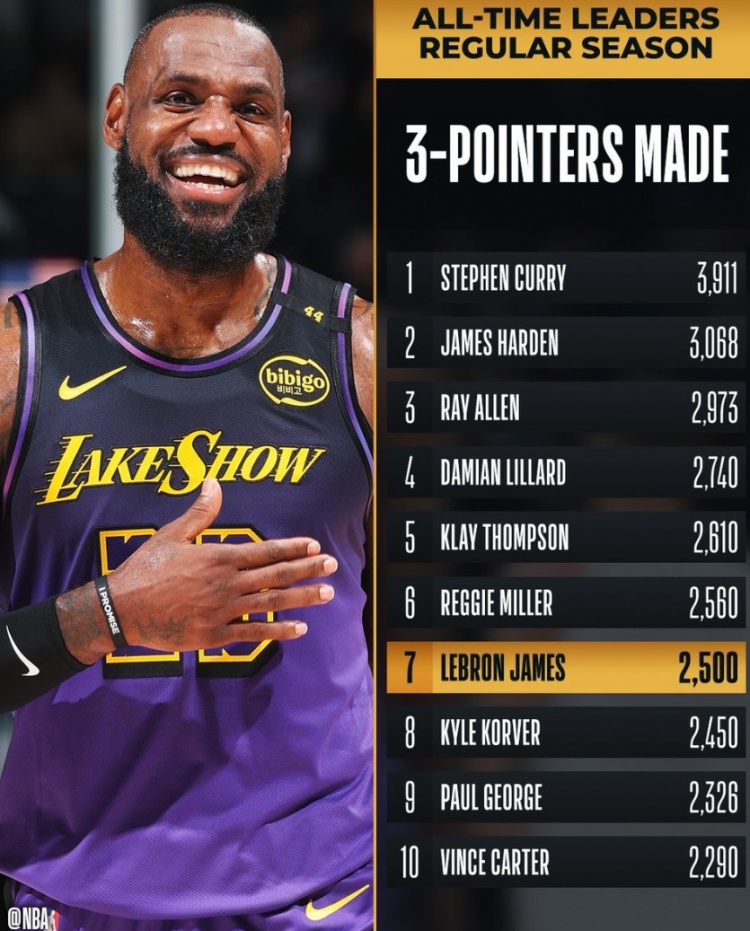 里程碑!詹姆斯生涯三分命中數(shù)突破2500 歷史第七人 2月2日訊 NBA常規(guī)賽,湖人和尼克斯的比賽正在進行中。詹姆斯投進了一記三分球,他的生涯三分命中數(shù)突破2500大關(guān),歷史第七人。 2025/02/02