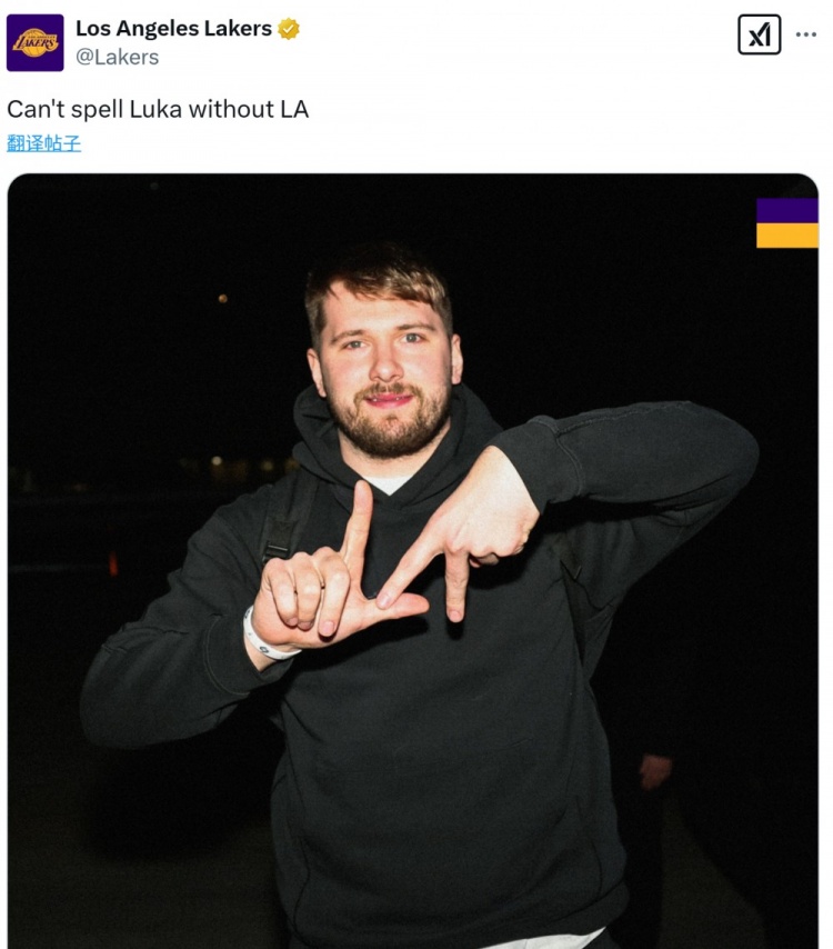 東契奇比“LA”手勢(shì)!湖人官方曬圖:少了這倆字母是拼不出Luka的 2月3日訊 東契奇今日已經(jīng)飛抵洛杉磯。湖人官方曬出了他比“LA(洛杉磯簡(jiǎn)稱(chēng))”手勢(shì)的照片,寫(xiě)道:“少了LA(這兩個(gè)字母)是拼不出Luka(盧卡)的?!? 2025/02/03
