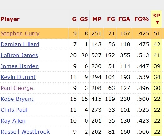 ?庫(kù)里全明星生涯共命中51記三分 NBA歷史第一&老詹排名第三
