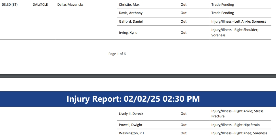 此役,歐文(右肩酸痛)、加福德(左踝酸痛)、PJ-華盛頓(右膝酸痛)、萊夫利(右腳踝應(yīng)力骨折)、德懷特-鮑威爾(右臀部拉傷)五人因傷缺陣。