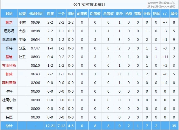 公牛開場后把三分作為主要進攻手段,首節(jié)他們?nèi)质指幸膊诲e,一度連進4記三分。首節(jié)公牛全隊三分12中7,其中鮑爾2中2。