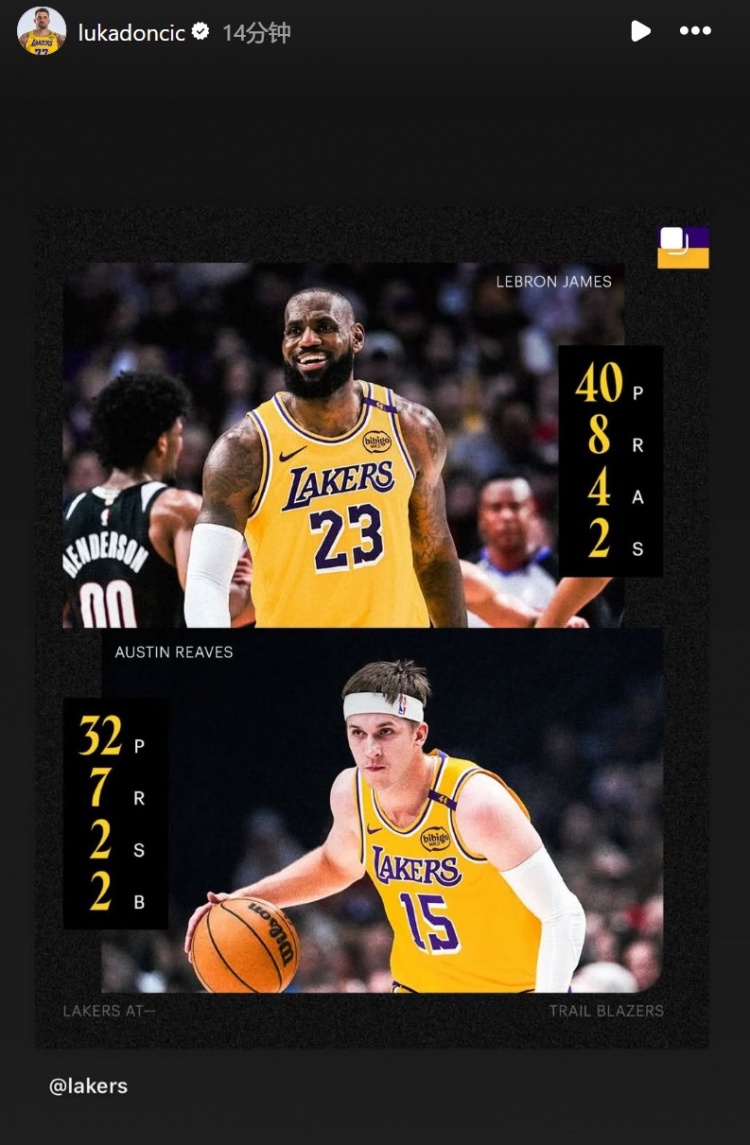 賽后,東契奇轉(zhuǎn)發(fā)了詹姆斯和里夫斯的本場表現(xiàn)。