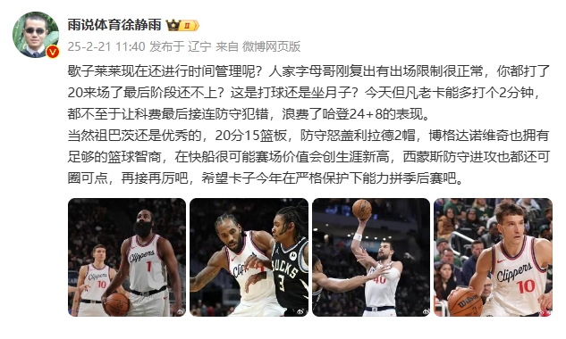 徐靜雨寫道:“歇子萊萊現(xiàn)在還進行時間管理呢?人家字母哥剛復出有出場限制很正常,你都打了20來場了最后階段還不上?這是打球還是坐月子?今天但凡老卡能多打個2分鐘,都不至于讓科菲最后接連防守犯錯,浪費了哈登24+8的表現(xiàn)。