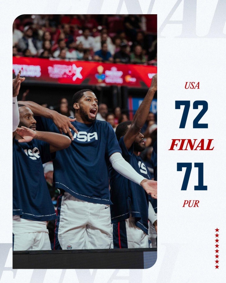 男籃美洲杯預選賽美國1分險勝波多黎各 目前4勝1負暫列D組第一