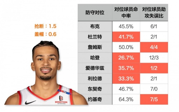 愛德華茲面對(duì)這位喬治亞大學(xué)的前隊(duì)友,則是攻也不行,傳也不行。不僅命中率被限制到35.7%的水平,失誤更是比助攻多......