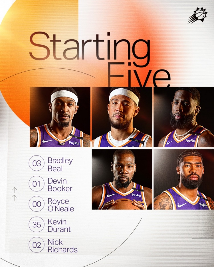 今日對(duì)陣猛龍!太陽(yáng)首發(fā):比爾、KD、布克、R-奧尼爾、理查茲
