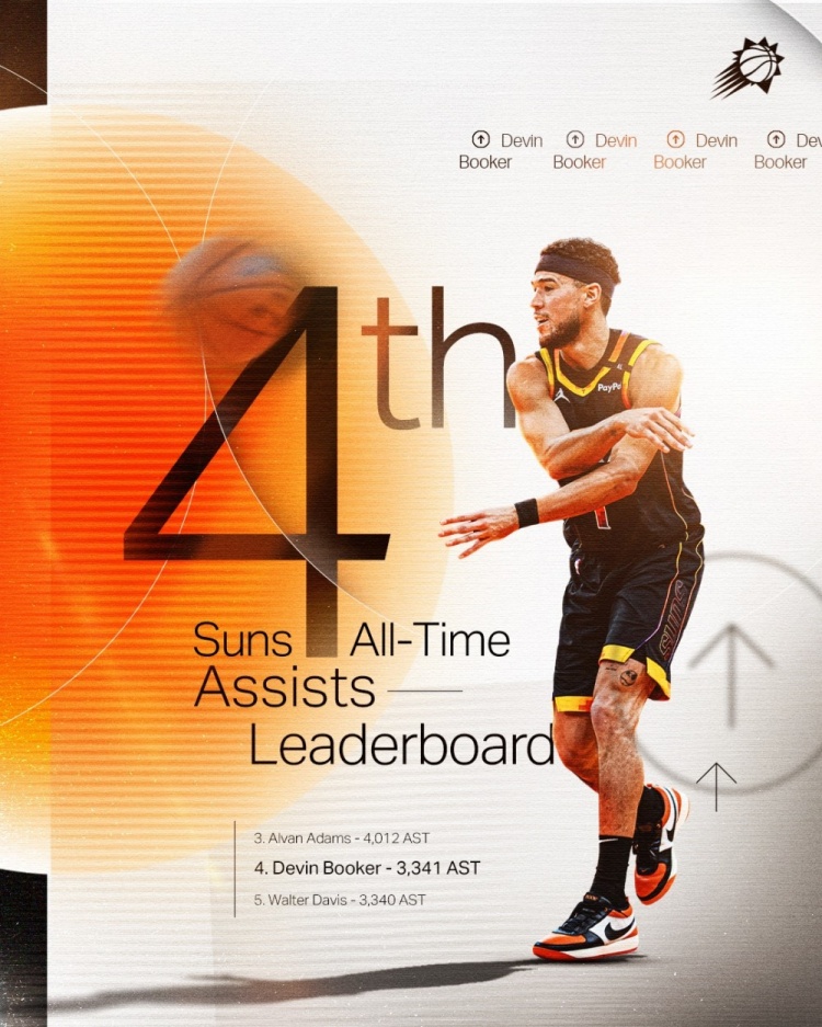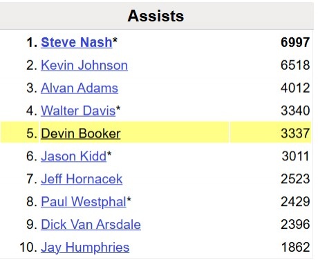 這樣一來(lái),布克太陽(yáng)生涯助攻數(shù)達(dá)到3341,超越沃爾特-戴維斯升至隊(duì)史第4。