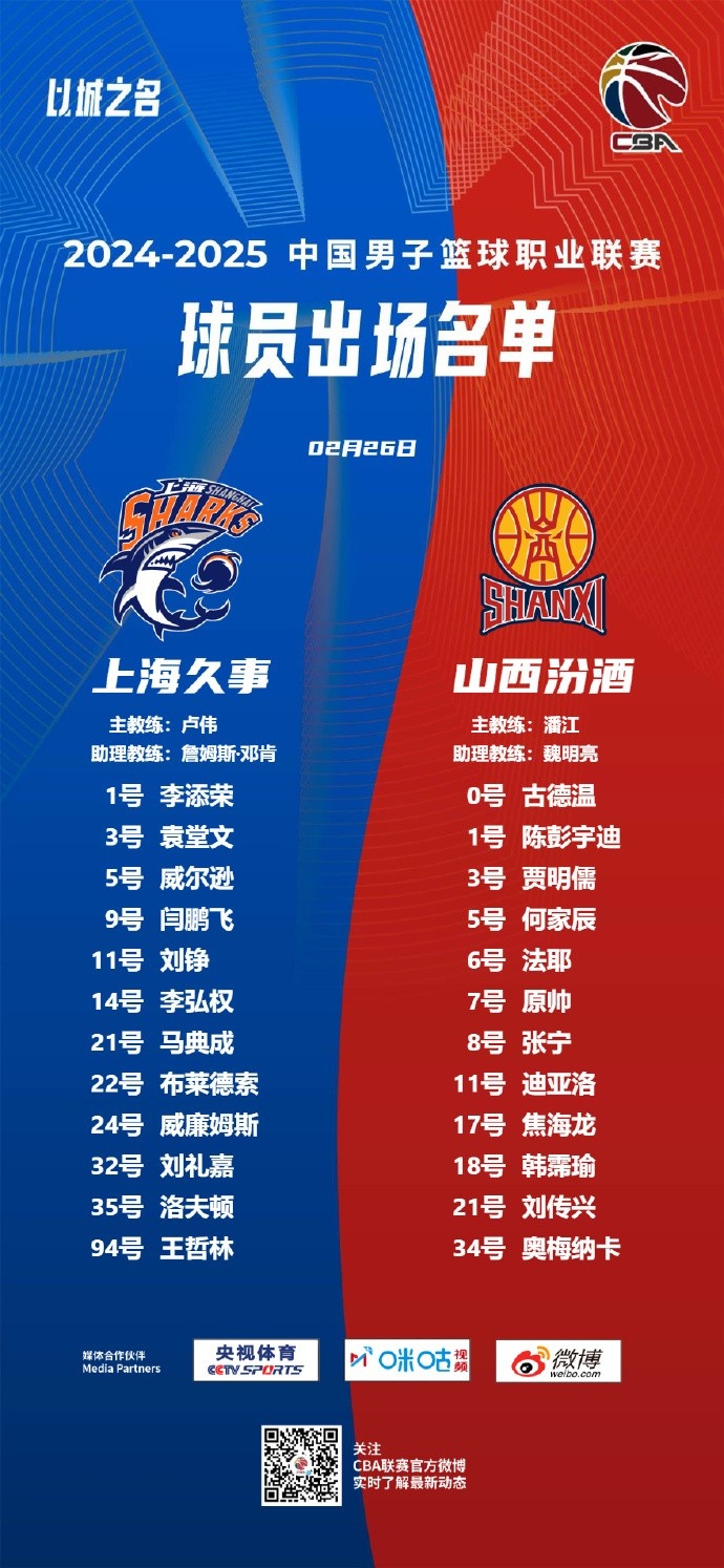 2月26日訊 CBA常規(guī)賽,上海將對(duì)陣山西。