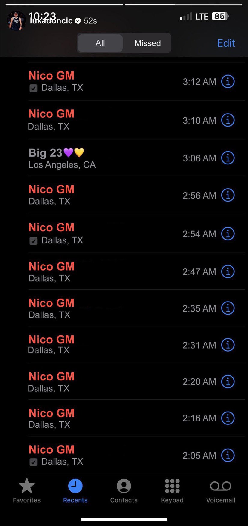 網(wǎng)傳被送去湖人的東契奇在社媒上曬出自己的通話記錄,獨行俠總經(jīng)理兼運營總裁哈里森連打10個電話他都沒接,但接了新隊友詹姆斯的電話。