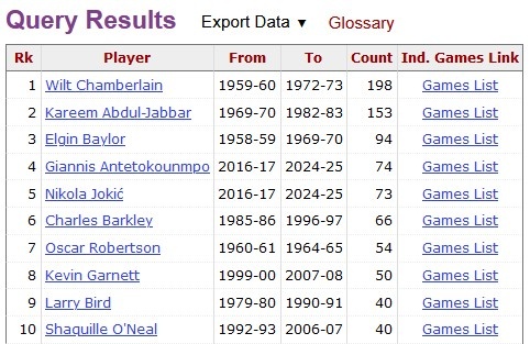 據(jù)統(tǒng)計(jì),這是字母哥生涯第75次砍下至少25分15籃板5助攻,這一成績(jī)能排在歷史第四。在他身前的是張伯倫(198次)、賈巴爾(153次)和埃金-貝勒(94次)。