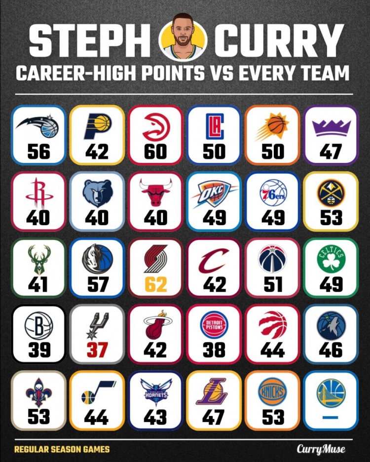 庫(kù)里對(duì)陣29隊(duì)最高分:9隊(duì)被掄下50+ 開拓者成最大受害者
