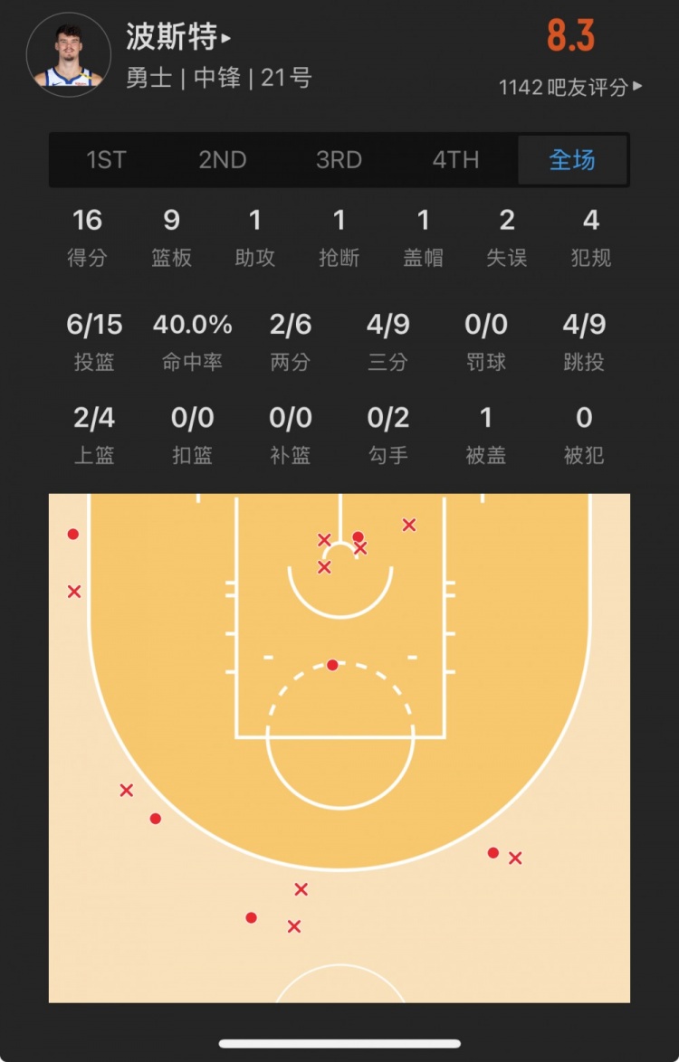 勇士52號秀 昆滕-波斯特 登場25.0分鐘