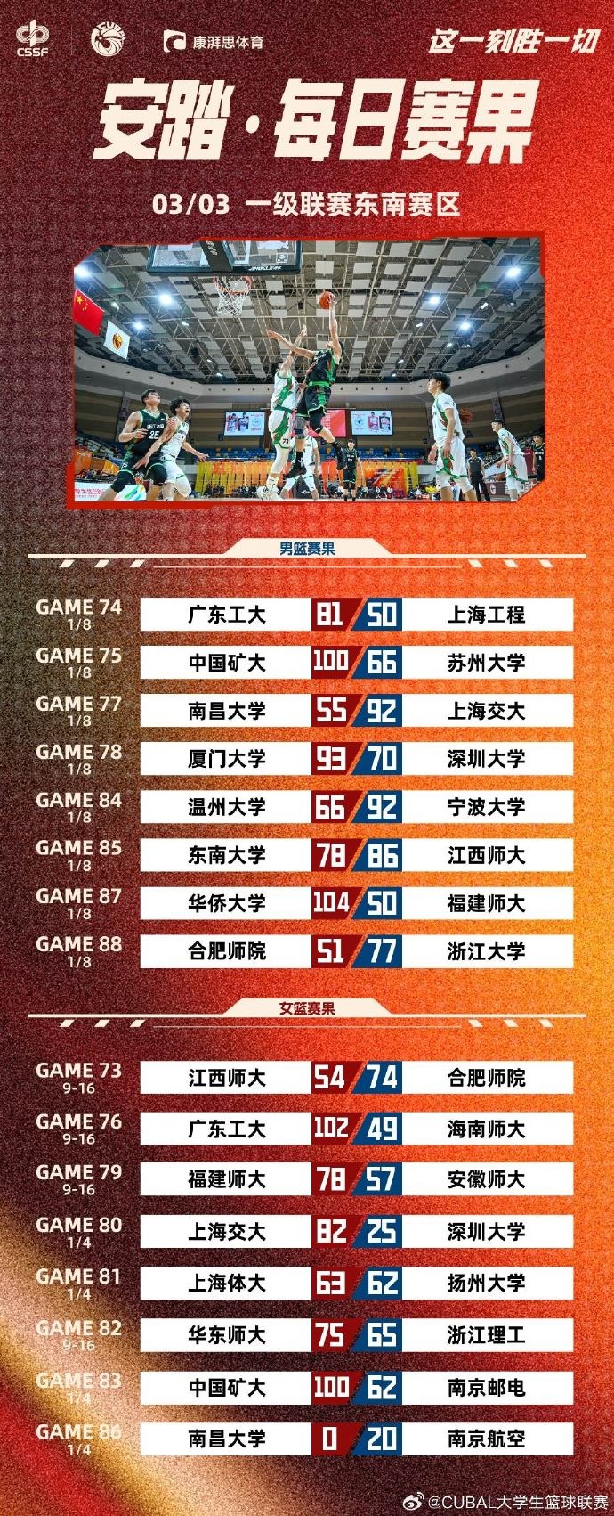 在今日的比賽中,廈門大學(xué)與深圳大學(xué)鏖戰(zhàn)到第四節(jié)才分出勝利。東南大學(xué)不敵江西師大遺憾落敗。女籃方面,揚(yáng)州大學(xué)1分惜敗上海體大。
