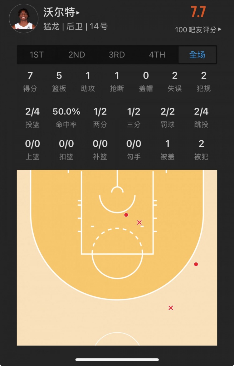 猛龍19號(hào)秀 賈科比-沃爾特 登場(chǎng)30.8分鐘